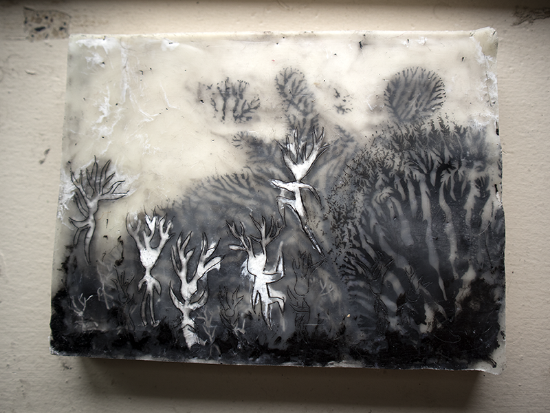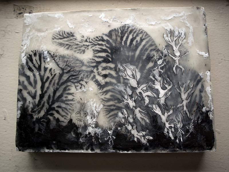 Set of three paintings that describe connection, porousness, and self similarity. Mediums include encaustic paintings and ink monotypes on birch cradle panels. 6" x 8"